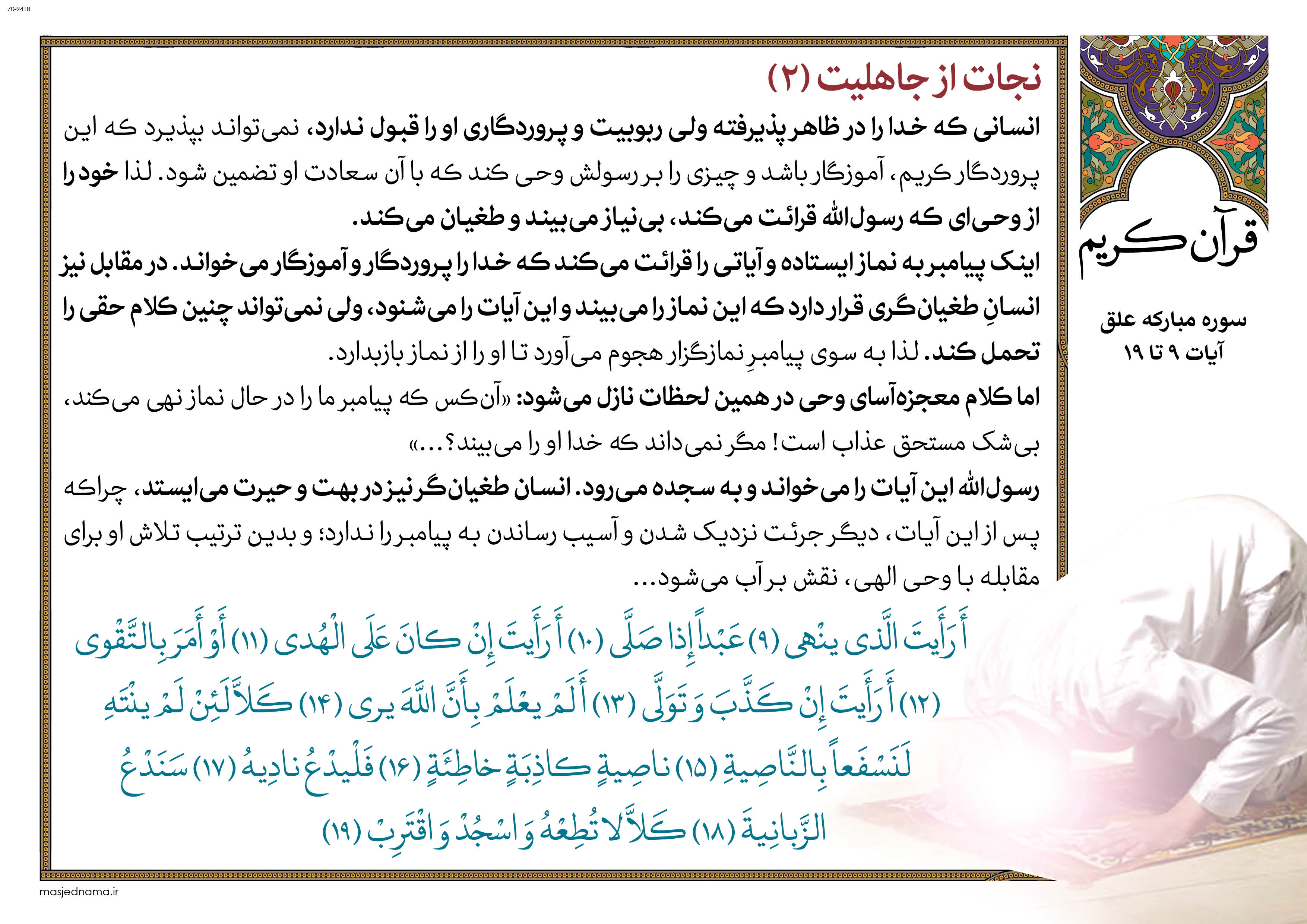 أَ رَأَیْتَ الَّذی یَنْهى (9) عَبْداً إِذا صَلَّى (10) أَ رَأَیْتَ إِنْ کانَ عَلَى الْهُدى (11) أَوْ أَمَرَ بِالتَّقْوى (12) أَ رَأَیْتَ إِنْ کَذَّبَ وَ تَوَلَّى (13) أَ لَمْ یَعْلَمْ بِأَنَّ اللَّهَ یَرى (14) کَلاَّ لَئِنْ لَمْ یَنْتَهِ لَنَسْفَعاً بِالنَّاصِیَةِ (15) ناصِیَةٍ کاذِبَةٍ خاطِئَةٍ (16) فَلْیَدْعُ نادِیَهُ (17) سَنَدْعُ الزَّبانِیَةَ (18) کَلاَّ لا تُطِعْهُ وَ اسْجُدْ وَ اقْتَرِبْ (19)