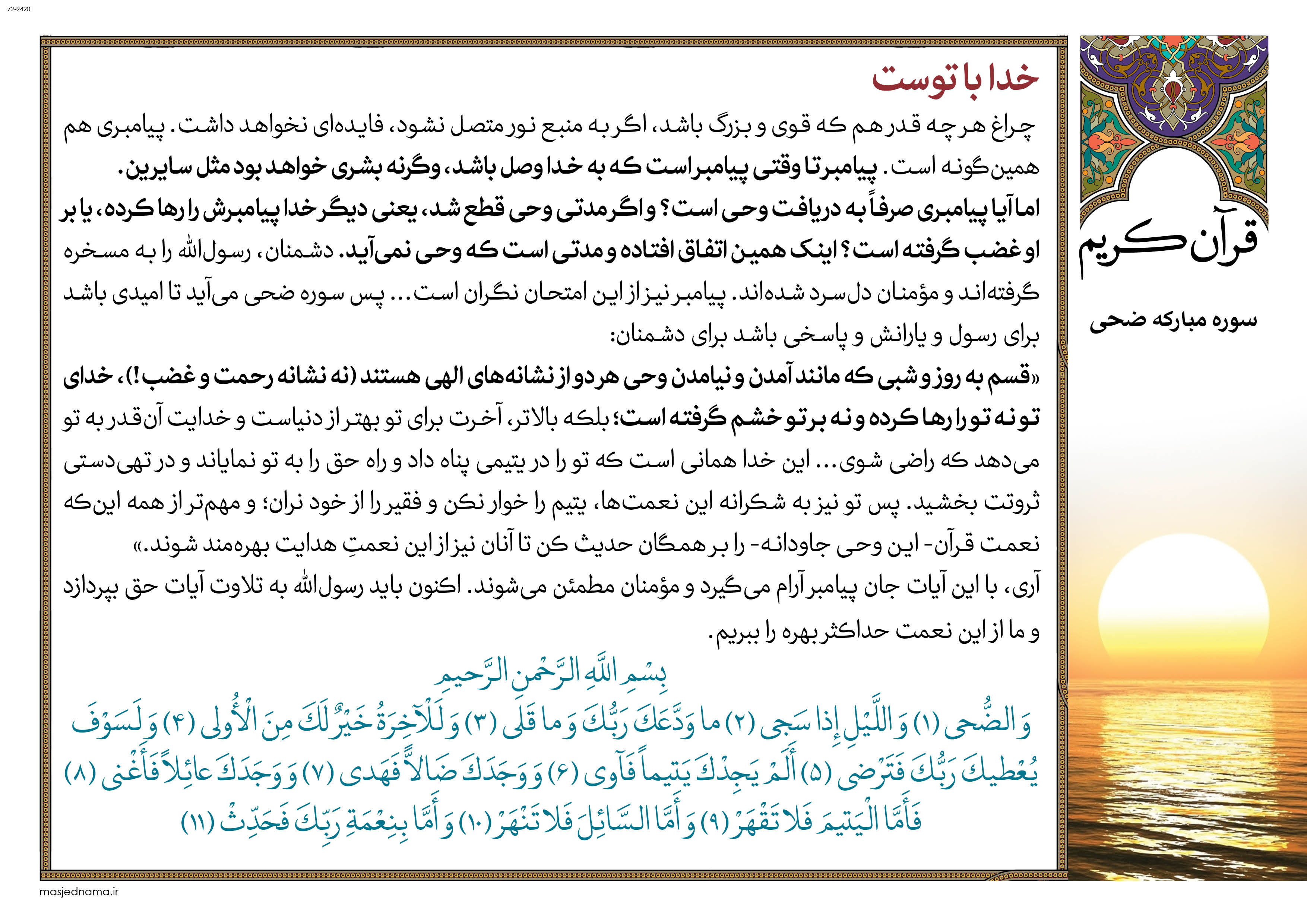 سوگند به آن دم که آفتاب بگسترد (1) و سوگند به شب، آن‌گاه که تاریکى¬اش فراگیر شود و آرام یابد (2) که پروردگارت [خلاف آن‌چه دشمنان می‌گویند] نه رهایت کرده و نه تو را دشمن داشته است. (3) [بالاتر از این، امیدوار باش! تو در این دنیا مورد رحمت ما هستی] و سراى آخرت قطعاً براى تو بهتر از این سرا خواهد بود (4) و به‌زودی پروردگارت در آن سرا [چنان] به تو عطا کند که خرسند شوى. (5) مگر تو را کودکى یتیم نیافت، پس به تو پناه داد؟ (6) ¬و تو را راه‌نایافته دید، پس هدایتت کرد (7) و تو را تهی‌دست یافت، پس توان‌گرت ساخت (8) پس تو نیز یتیم را خوار و مغلوب مکن [که خود درد یتیمى را احساس کرده¬اى] (9) و سؤال‌کننده را که از تو مالى مى‌طلبد، از خود مران و بر او بانگ مزن [که خود تلخى تنگ‌دستى را چشیده¬اى](10) [و تو که با نعمت وحی راه‌یافته‌ای،] پس نعمت پروردگارت (قرآن) را بازگوى. (11)